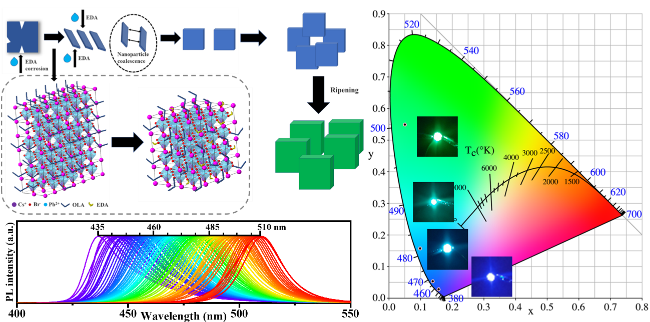 近日,孙春副教授带领研究团队开发了一种腐蚀生长合成策略,以获得尺寸可调和强量子限制效应的铅基卤化物钙钛矿纳米片。首先通过成核过程获得n=2纳米片。通过锰-配体相互作用稳定,可以用作生长的起始材料(种子)。使用乙二胺来腐蚀一些有缺陷的种子纳米片,以释放单体。然后这些单体在稳定种子纳米片上继续生长。通过仔细调整乙二胺的量和添加次数,可以获得厚度可控的纳米颗粒,发射波长可在435 nm至510 nm之间调节,步长可达1 nm。在整个过程中,乙二胺的螯合作用钝化并稳定了纳米颗粒,实现了显著的稳定性和接近100%的发光效率。此外,由于其拥有很好的光电特性,通过使用制备的纳米颗粒作为颜色转换层来制造了明亮的紫蓝色、蓝色、青色和绿色单色发光二极管,显示出LED的重大应用潜力。