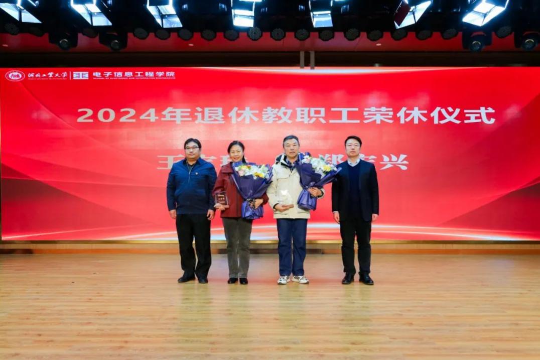表彰仪式后,学院举行了退休教师荣休仪式。党委书记赵其波,院长王雨雷为荣休教师王宝珠教授、郑宏兴教授颁发纪念奖杯并献花,感谢两位老师在工大教书育人数十年如一日坚持,并对两位老师的退休生活许下最美好的祝愿。