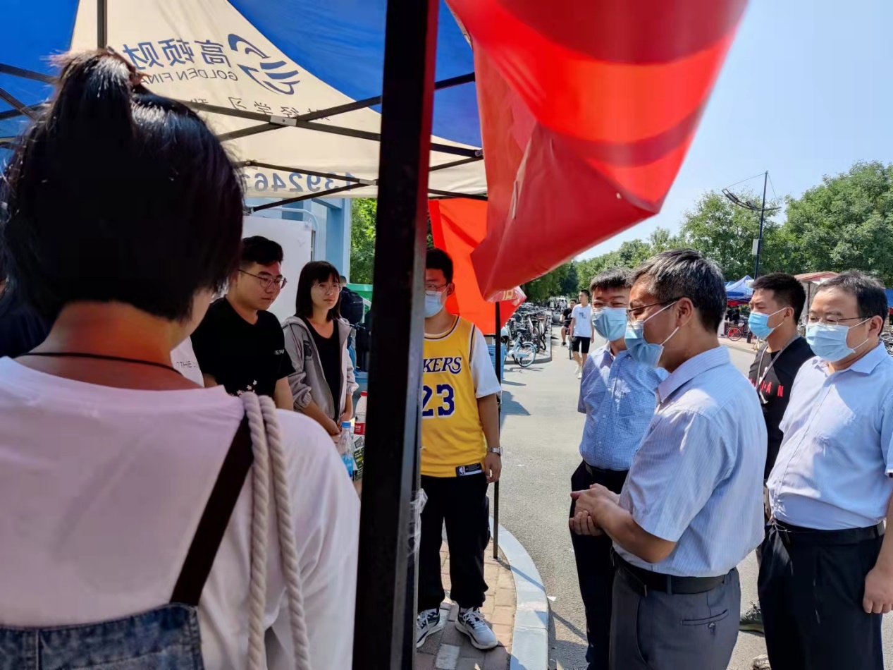 由于大二的学生正在军训,所以本次迎新工作由少数提前到校的新生完成。在位于宿舍楼下的迎新点,周建伟书记对迎新工作人员表示慰问,对于新生积极参与到迎新工作表示肯定。