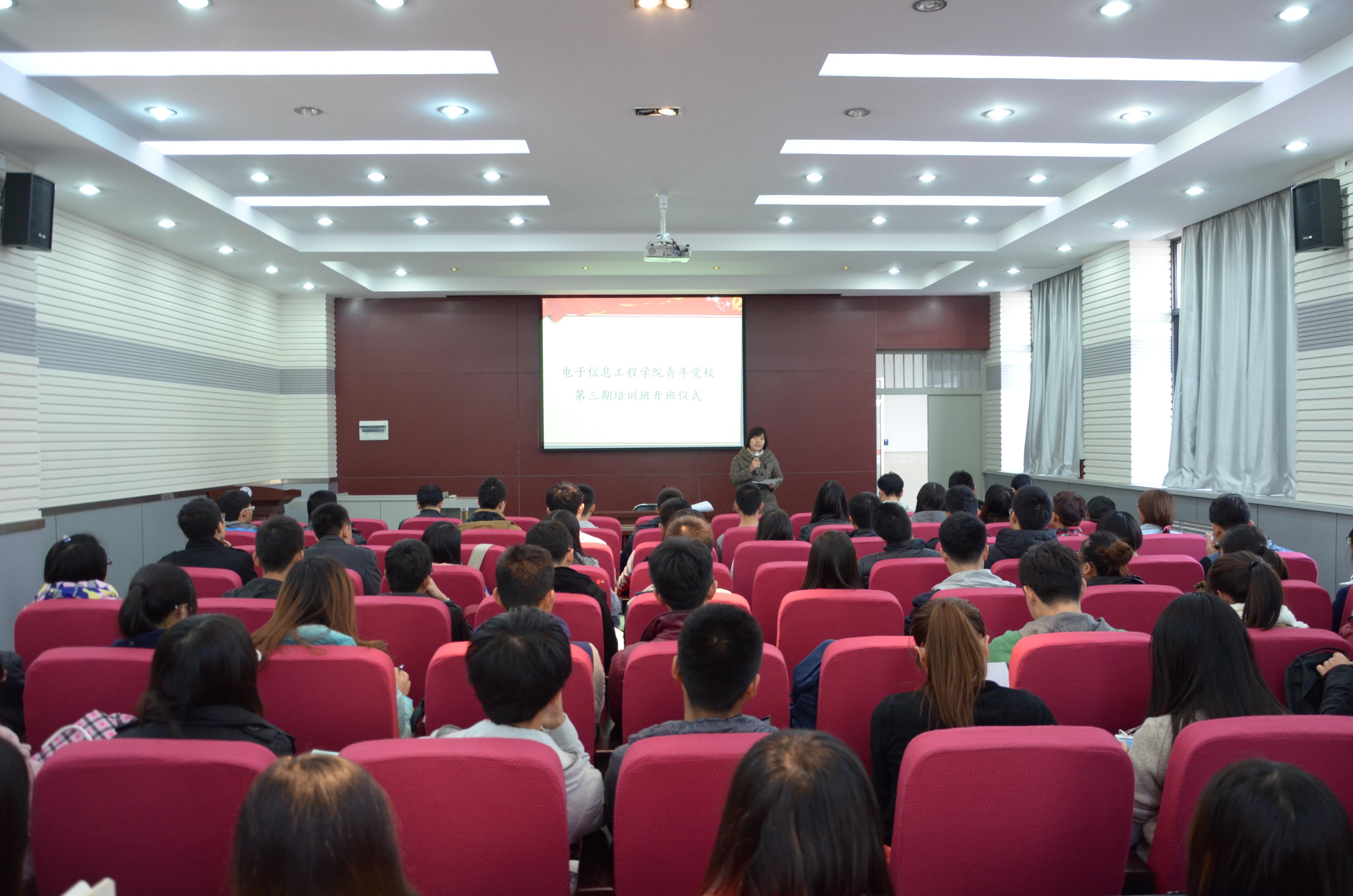 为引导青年大学生学习党的理论知识,端正入党动机,坚定共产主义信念,激励青年大学生不断提高个人素质和党性修养, 2014年11月28日下午,电信学院第三期青年党校正式开班,参加本期培训班的学员共计76名。出席本次开班仪式的有学院党委书记任福战老师、学院党政办公室主任兼党务干事刘丽老师、学院团委书记李铁老师、辅导员张慧敏、方正老师。开班仪式由张慧敏老师主持。