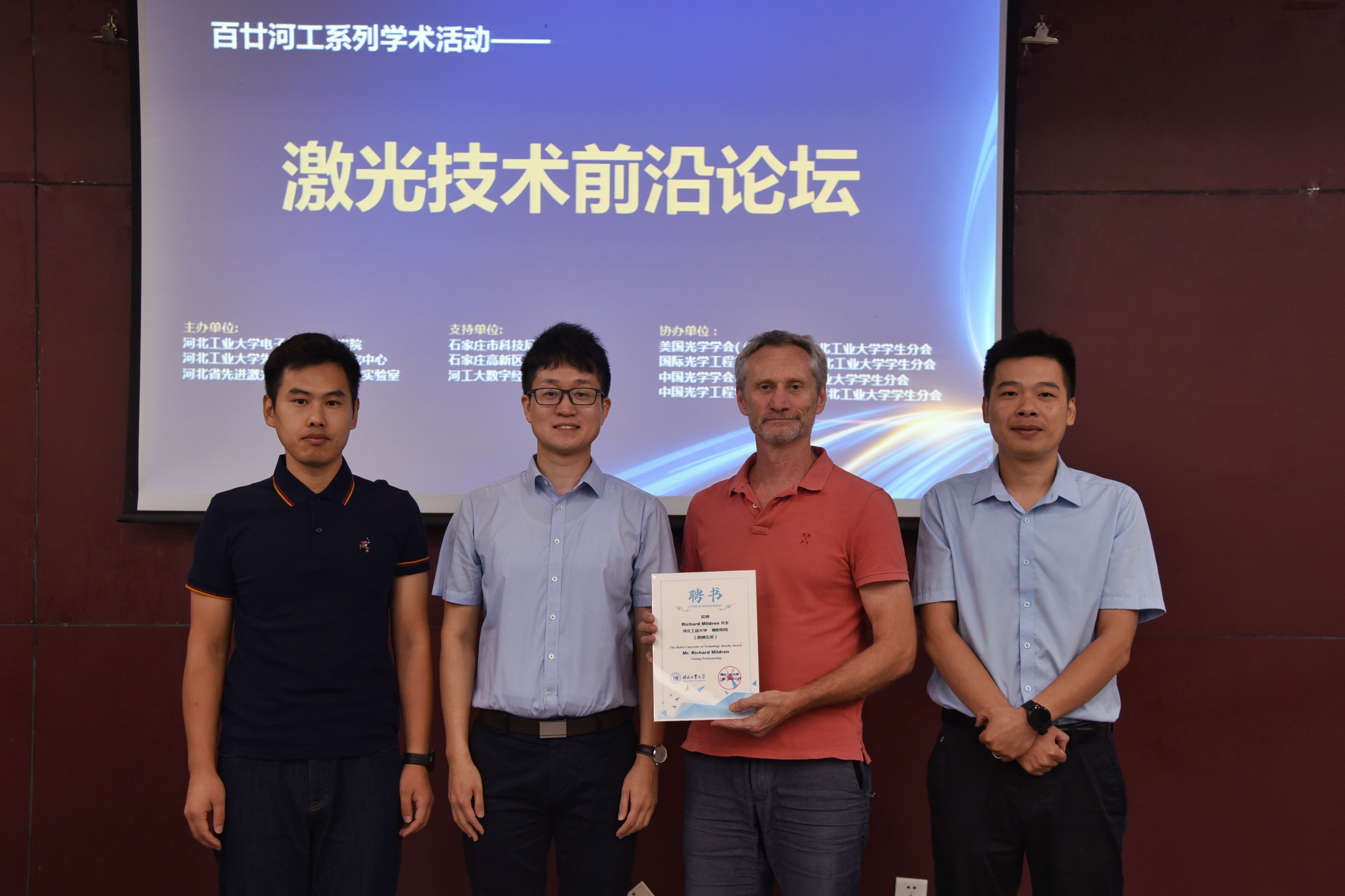 论坛的开幕式由william威廉中文院长助理廉玉东副教授主持。我校研究生院挂职副院长、william威廉中文院长助理白振旭教授代表学校向参与论坛的学者表示热烈的欢迎和诚挚的感谢,他表示本次论坛在学校建校120周年之际举行,具有非凡的意义,希望参会的师生能够通过本次论坛深入推进学术交流和合作,同时也热切期盼专家们能够为我校激光技术的发展和产业转型提供宝贵建议。开幕式上,william威廉中文院长助理白振旭、廉玉东,以及河工大数字经济产业研究院院长李哲,共同为我校国家留学基金委创新型人才国际合作培养项目的合作单位,澳大利亚麦考瑞大学光子中心副主任、澳大利亚顶级科技奖Eureka奖获得者Richard Mildren教授颁发了兼职教授聘书。