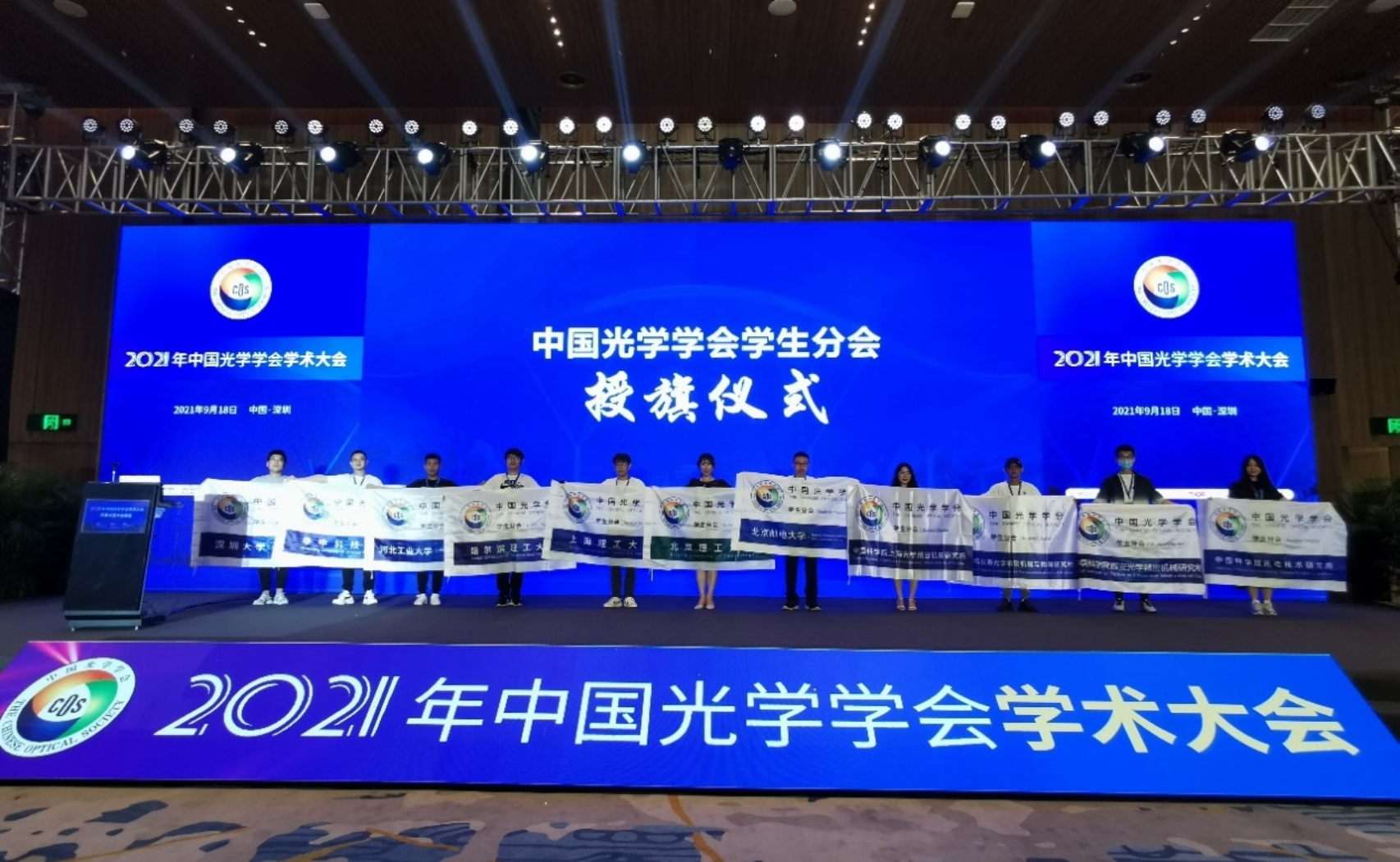 9月18日,2021年中国光学学会学术大会在深圳国际会展中心成功召开。开幕式上举行了中国光学学会光学科技奖颁奖仪式、中国光学学会光学优秀博士学位论文颁奖仪式、中国光学学会学生分会授旗仪式。依托我院的中国光学学会(COS)分会成员应邀参加了此次的学生分会授旗仪式,由中国光学学会理事长、中国科学院院士龚旗煌教授和中国光学学会副理事长任晓敏教授为包括我校在内的新一批学生分会授旗。截至目前,中国光学学会在全国高校和研究所共设立学生分会24个,我校为河北省第一个成立中国光学学会学生分会的单位。