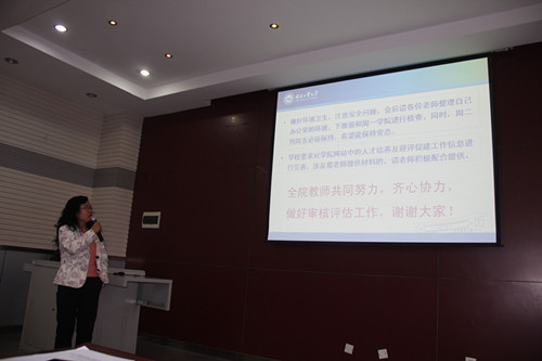 最后 院长娄淑琴、书记任福战做总结发言,要求全体教师要高度重视在评估审核工作中的各项任务要求,按照学校的总体部署和学院的具体工作安排,统一思想、凝心聚力,以饱满的热情和高度的责任心参与到本次审核评估及相关建设工作中去,为学院的评建工作深入推进打下坚实的基础。