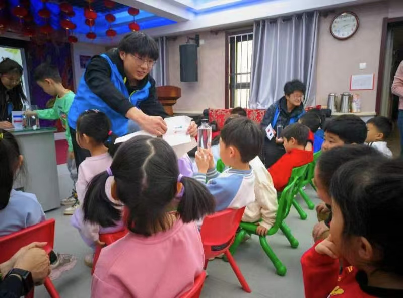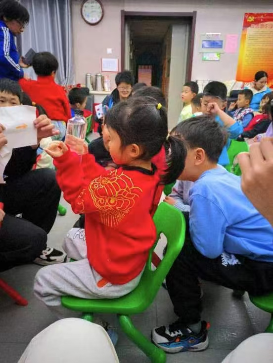 志愿者们先以“魔法硬币”小故事引入,成功引起孩子们的好奇心。接着,通过硬币、玻璃杯和水等简单道具,展示了硬币“消失”又“重现”的神奇景象。孩子们个个目不转睛,在志愿者的引导下积极思考、热烈讨论。志愿者详细解释了光的折射原理,并鼓励孩子们亲自上手操作,帮助他们在实践中真切感受到科学的魅力。