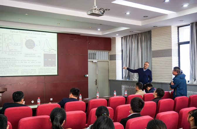 会上徐庶老师介绍了学院和学科发展情况。Andrey Rogach教授和各来访学者对各自科学研究方向和内容进行了介绍,展示了各类新型微纳光电材料和光伏、LED、催化、生物传感和分析等先进光电器件的最新前沿进展,并就器件和材料中的关键问题和挑战进行了讨论。会上学生踊跃发言,和各来访学者进行了深入细致的交流。