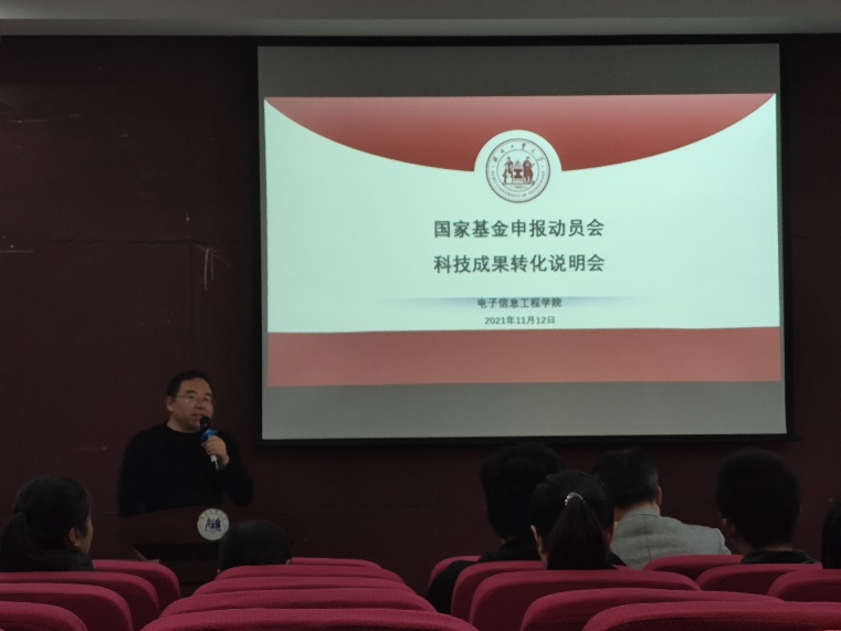 2021年11月12日下午,电信学院在西教2号楼102报告厅,召开了2022年国家自然科学基金申报动员会及科技成果转化宣讲会。学院党委书记周建伟、院长王雨雷、副院长周亚同、国家基金面上项目获得者郑宏兴、青年基金获得者罗明明以及2022年度国家自然基金申报教师参加会议。会议由学院副院长周亚同主持。